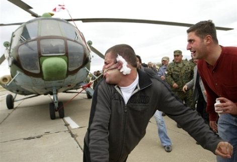 現(xiàn)年27歲的前摔跤冠軍拉沙•帕塔拉亞(Lasha Pataraya)搓了搓耳朵,在耳朵后面塞棉花,深深地吸了一口氣,開始了他的超級大挑戰(zhàn),用耳朵拉動米-8俄羅斯軍用直升機(jī)。