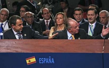 在這種情況下,坐在薩帕特羅身后的西班牙國王卡洛斯突然向前探身,告訴查韋斯,“你為什么還不住嘴?”據(jù)稱,卡洛斯使用的語言是西班牙人一般用來和熟人聊天或是教訓(xùn)孩子的。薩帕特羅之后表示,表達個人意見“不應(yīng)該冒犯其他人”。