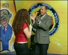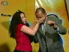 這位剽悍的紅衣女子,是與委內(nèi)瑞拉總統(tǒng)查韋斯同黨的國會(huì)議員薇瑞拉(Iris Varela)。一旁身穿灰色西裝的則是政論節(jié)目記者阿佐卡爾(Gustavo Azocar)。20日的現(xiàn)場節(jié)目中的激烈打斗讓全委內(nèi)瑞拉的觀眾目瞪口呆。