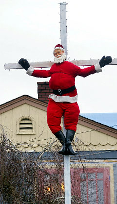 中新網(wǎng)12月24日電 美國(guó)華盛頓布萊摩頓居民康洛德最近對(duì)圣誕節(jié)彌漫的“消費(fèi)主義”十分反感,他的反感已經(jīng)不僅僅體現(xiàn)在避開購物中心和關(guān)掉電視這么簡(jiǎn)單了,而是將圣誕老人釘在自家房前15英尺高的十字架上。