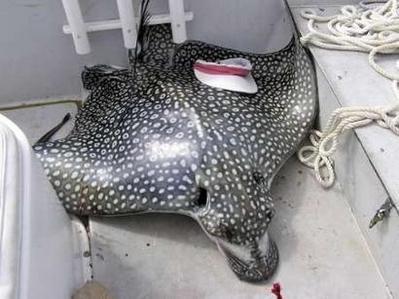 斑點(diǎn)黃貂魚(yú)能夠長(zhǎng)到200多公斤,翼展能夠長(zhǎng)到3米左右,它們偶爾會(huì)躍出水面但是攻擊性并不強(qiáng),也會(huì)用它們尾部堅(jiān)硬的毒鉤進(jìn)行防御。