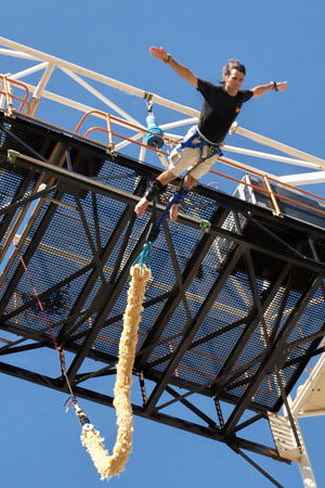 南非擁有世界上最高的蹦極點,熱衷蹦極的人們常常在南非找刺激。近日,一位另類的蹦極手創(chuàng)下了蹦極運動的新紀錄:37歲的葡萄牙男子卡爾·迪奧尼西奧用1.85萬個安全套做成30米長的彈性繩,代替?zhèn)鹘y(tǒng)尼龍繩跳下蹦極臺,將“生死一線牽”的感覺發(fā)揮到極致。