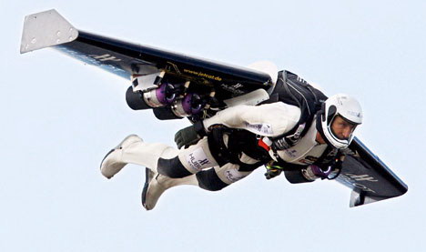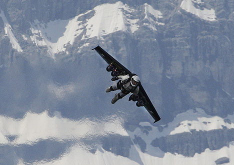 前瑞士戰(zhàn)斗機飛行員羅西花了五年的時間來建造和完善動力翼套裝,他昨天穿著這套動力翼套裝跳離了一架小型飛機。當他從2250米的飛機上跳下時,他展開了長達3米的動力翼,動力翼被綁在他的身后。當從自由落體狀態(tài)轉(zhuǎn)為滑行狀態(tài)后,他啟動了四個發(fā)動機,這使他的飛行速度加速至每小時304公里。他在爬升至780米后再次向地面俯沖,在身后留下一串特效煙霧。