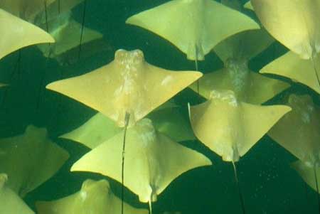 從鰭尖到鰭尖,牛鼻黃貂魚寬2.1米,以成群結(jié)隊進行長途遷徙而出名。在大西洋,它們春季末向北遷徙,秋季末則向南遷徙。據(jù)估計,這次墨西哥海灣遷徙的牛鼻黃貂魚多達10萬條,從美國佛羅里達順時針前往墨西哥的尤卡坦半島。