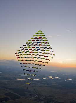 據(jù)報道,為實現(xiàn)這一絕技表演,100名跳傘隊員進(jìn)行了7年的計劃和訓(xùn)練。他們從5架不同飛行高度的飛機上跳下,在美國佛羅里達(dá)幾千英尺外的高空上拼成巨大的菱形,表演壯觀驚人,引人注目。