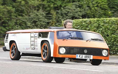 這輛露營車被命名為“敞篷蛋糕(Van-Cake)”,時速最高可達(dá)128公里/小時。桑德斯的團(tuán)隊將原有大眾車1.38米高的頂棚切割掉,改裝成了一個35厘米高的頂棚。他們在車內(nèi)放入新的操縱系統(tǒng)和低矮的座位。受制于空間,這輛車不是使用腳剎,取而代之的是手動剎車和變速桿;燃料槽也是經(jīng)過特別制作的。目前已經(jīng)取得合法上路的資格。由于這輛車非常矮,它可以輕松地從停車場柵欄下通過。
