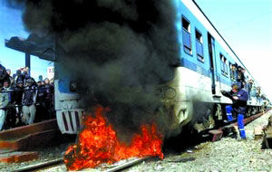 阿根廷電視臺(tái)畫(huà)面上,布宜諾斯艾利斯西郊梅洛站停靠的一列火車(chē)冒著黑煙,火焰吞沒(méi)整列火車(chē)。在鄰近梅洛的卡斯特拉爾站,乘客向售票處投擲石塊,站在鐵軌上阻止列車(chē)進(jìn)站。