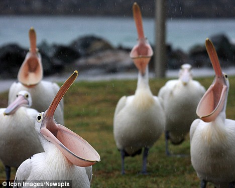 澳洲數(shù)只鵜鶘同時張開喙接雨水