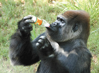 印度動物園里的大猩猩Polo專心喝飲料