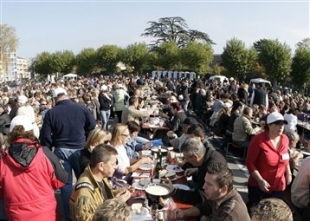 他們把980千克奶酪和420升白酒混合在一起攪拌,然后將成品分成950鍋,分發(fā)給5000名食客。這些觀眾把意大利的經(jīng)典白面包倒在這融化的奶酪里,津津有味地品嘗,場面極其壯觀。