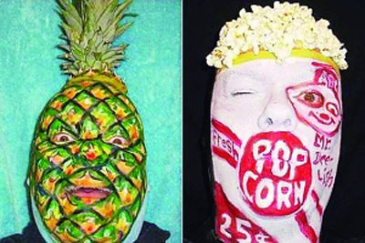 據(jù)報道,從今年3月開始,詹姆斯每天都喜歡用油彩往自己臉上畫一幅不同的畫,這些畫都畫得非常逼真。當他往臉上畫一個菠蘿時,很多人乍一看還真以為他腦袋上長出了一個菠蘿。詹姆斯稱,他是看到有些人每天都為自己拍攝一張照片后,才有了這個想法的,“臉色天天變,那將是一件多么有趣的事!