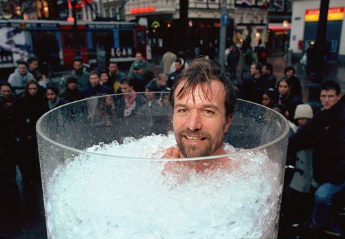 綽號(hào)“冰人”的荷蘭人威姆·霍夫因?yàn)榫哂谐5目箖瞿芰Χ劽谑馈H缃,他又要向新的世界紀(jì)錄發(fā)起沖擊了,12月20日,他將在德國科隆嘗試打破由他自己保持的在裝有大量冰塊的5英尺(1.52米)高的樹脂玻璃容器中半裸堅(jiān)持的最長時(shí)間紀(jì)錄。