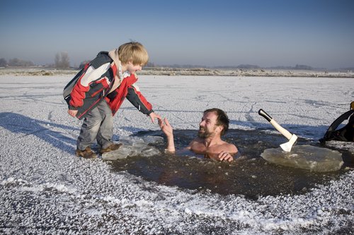 霍夫說:“我當(dāng)時(shí)和某人在公園散步,看到了冰。我突然冒出個(gè)想法:要是站到冰中會(huì)怎樣呢?我非常想試一下。于是,我脫掉衣服,在里面站立了30秒。出來后,我有一股強(qiáng)烈的愉悅感。從那以后,我每天都這樣做!