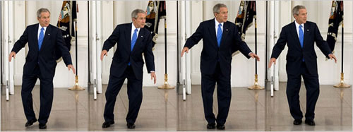 2008年3月5日,在獲得黨內(nèi)提名所需的1191張黨代表票后,美國共和黨總統(tǒng)候選人約翰·麥凱恩前往白宮,與總統(tǒng)布什共進(jìn)午餐,作為布什正式宣布支持他的前奏。但布什卻被麥凱恩晾在白宮北門等了好一會(huì)兒。早早來到白宮北門的布什左等右等麥凱恩不到,為了調(diào)節(jié)氣氛,竟然在眾位記者面前獨(dú)自跳起踢跶舞來。