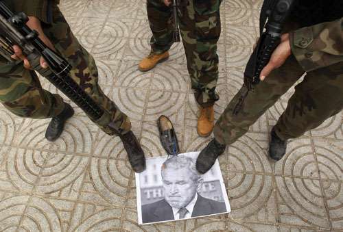 周日在布什同馬利基聯(lián)合舉行的新聞發(fā)布會(huì)上,扎伊迪脫下自己的鞋子,怒向布什砸去,同時(shí)用阿拉伯語(yǔ)大喊,“這是臨別之吻,你這禽獸。這是孤兒寡婦以及在伊拉克喪生的人送給你的!”扎伊迪隨后被安全人員按倒在地,帶離了會(huì)場(chǎng)。