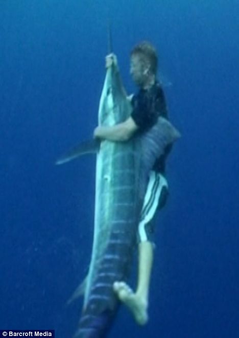 這名男子今年33歲。據(jù)他稱,一生中盡和大魚打交道了,在捕魚表演方面經(jīng)驗豐富。有一次在沖浪板上捕魚的時候,槍魚把他拽出11公里。最驚險的一次就是從直升飛機上跳下,徒手捕到一只槍魚。