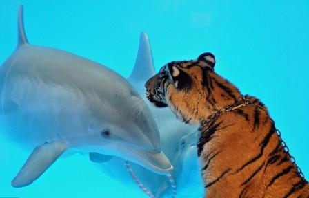 孟加拉雌性幼虎阿卡薩只有6個月大,而海豚馬利克則已有1年2個月大。據(jù)游樂園工作人員介紹,小虎阿卡薩是在被飼養(yǎng)員帶領散步時結(jié)識到了這位海豚好友。