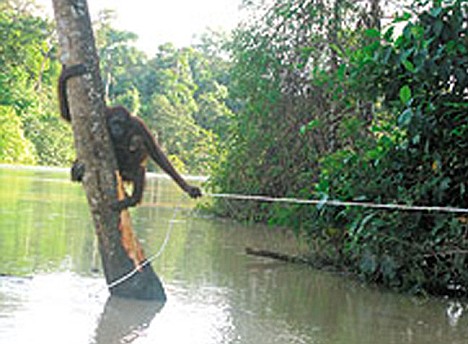 長期以來人們相信大猩猩是怕水的,但是這只母猩猩根本就沒有猶豫。這只大猩猩抓住繩子,背上自己的幼兒,在水中奮力滑動,游至岸邊。在水里的時(shí)候,她始終努力保證小猩猩的頭部在水上。