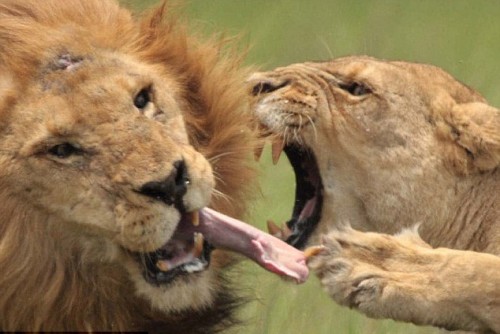 正在博茨瓦納奧卡萬戈三角洲觀察獅群的野生動(dòng)物攝影師李維坦拍下了這組驚人的畫面。據(jù)他描述,當(dāng)時(shí)鄰近一只處在發(fā)情期的母獅朝公獅發(fā)出曖昧的呼喚,公獅的雌性伴侶立即醋意大發(fā),并試圖阻止公獅接近那只發(fā)情的母獅。然而,公獅全然不顧伴侶的警告,尋著母獅的叫聲蹦去,結(jié)果就發(fā)生了照片中驚人的一幕。