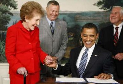 奧巴馬扶著88歲的南希慢步走進(jìn)儀式禮堂。來到簽署臺(tái),南希站在奧巴馬旁邊,左手扶在奧巴馬的肩膀上看奧巴馬簽字。