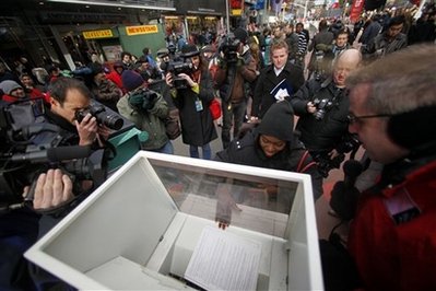 第三屆“大掃除日”(Good Riddance Day)前天在紐約時(shí)報(bào)廣場(Times Square)舉行,現(xiàn)場碎紙機(jī)轉(zhuǎn)個(gè)不停,一年來的厄運(yùn)也象征性的一掃而空。