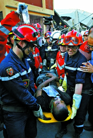 法國救援隊23日從瓦礫里救出了一名24歲的海地男子。這名男子已經(jīng)被埋了11天。救援隊員們激動地說:“這簡直就是生命奇跡!