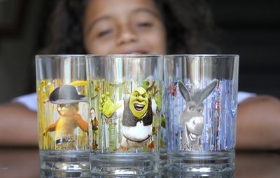 這種玻璃杯1個售價為2美元,杯身印有電影《怪物史萊克4》中的角色形象,一共有4款。杯子一杯可盛16盎司飲料。