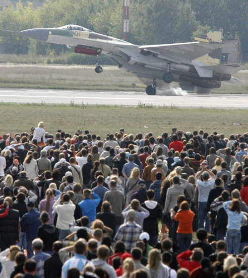 圖片是8月22日周六在航展上蘇-35飛行資料圖。有參觀者還誤以為是俄新式戰(zhàn)機在進(jìn)行特技表演。照片清楚顯示,飛機降落時發(fā)生傾斜,靠右側(cè)起落架落地。駕駛該飛機的是第一個(2008年2月)駕駛蘇-35的飛行員謝爾蓋•伯格達(dá)。(梁小逸)