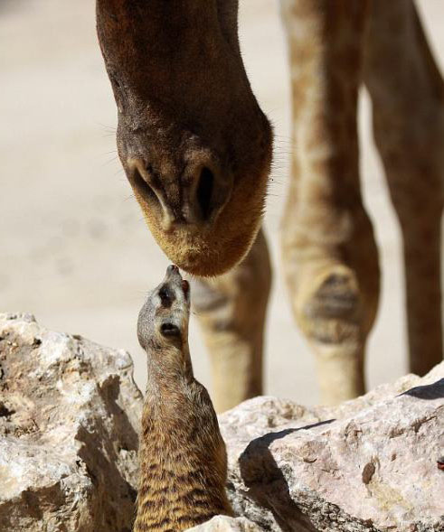 中新網(wǎng)2月22日電 據(jù)臺(tái)灣“今日新聞”22日援引英媒報(bào)道,看過動(dòng)物星球頻道的《狐獴大宅門》嗎?這里有該頻道沒辦法拍到的畫面──攝影師阿方索帕茲(Alfonso Paz)在葡萄牙里斯本動(dòng)物園直擊,一只厚臉皮的狐獴(又稱貓鼬),竟主動(dòng)向長(zhǎng)頸鹿索吻!逗趣的一瞬間也被拍了下來(lái)。