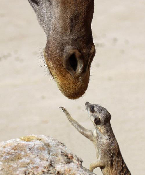 報(bào)道稱,40歲的阿方索說,他看到兩只狐獴從住處溜了出來(lái),一路往長(zhǎng)頸鹿的圍欄方向玩耍,最后終于溜了進(jìn)去,當(dāng)其中一只狐獴站在兩塊石頭中間,一只小長(zhǎng)頸鹿湊了過來(lái)。