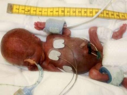 這名男嬰于2009年6月出生,比預(yù)產(chǎn)期提前了15周。當(dāng)時他在母親體內(nèi)有危險,醫(yī)生立即實(shí)施了剖腹產(chǎn)。出生時男嬰極其纖弱,大小和一張A4紙差不多,體重只有275克,輕得像一塊黃油。醫(yī)生不得不把他放在保育箱里,但是仍然不能保證其成活。經(jīng)過6個月的精心護(hù)理,2009年12月,這名男嬰體重增加到3.7公斤,和一名足月的新生兒差不多大小,順利出院。