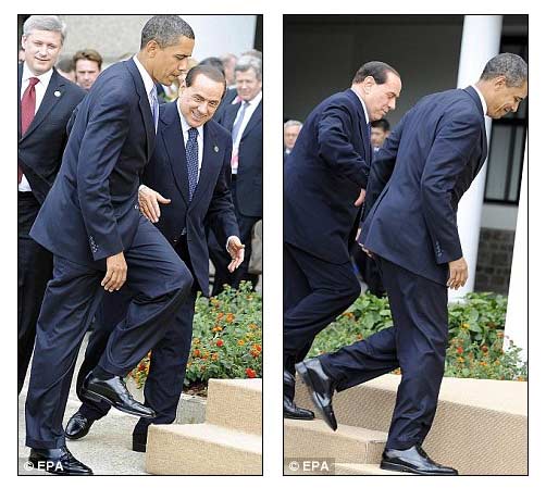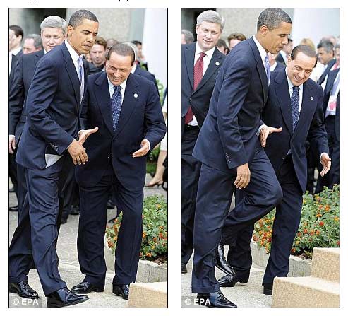 據(jù)英國(guó)《每日郵報(bào)》7月9日?qǐng)?bào)道,作為G8峰會(huì)上的重量級(jí)人物,奧巴馬的到來讓意大利總理貝盧斯科尼喜出望外。然而這次貝氏可謂是“熱臉貼上了冷屁股”,他滿臉堆笑地伸出手,要和奧巴馬握手,但對(duì)方卻對(duì)他“視而不見”,直接從他前面走過。
