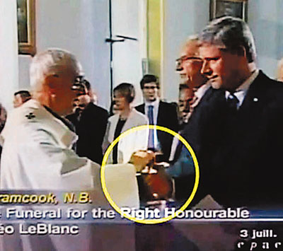據(jù)香港文匯報報道,哈珀上周出席加拿大前總督勒布朗的天主教葬禮,流傳在YouTube上的電視畫面顯示:哈珀領了圣餐(見圖),但鏡頭停留的數(shù)秒鐘中,都沒有哈珀把圣餐餅放入嘴中的動作。