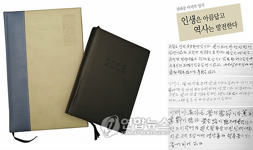 這本小冊(cè)子長(zhǎng)達(dá)40頁(yè)的小冊(cè)子中,含有金大中在人生晚年對(duì)生活的感悟和作為前總統(tǒng)對(duì)時(shí)局的認(rèn)識(shí)。在日記里,金大中似乎預(yù)見(jiàn)到自己已沒(méi)有多少時(shí)日,回顧自己波瀾壯闊的人生歷程,寫(xiě)下了留給后世的“箴言”。他還提到健康問(wèn)題和對(duì)一生伴侶李姬鎬女士的真摯的感情。