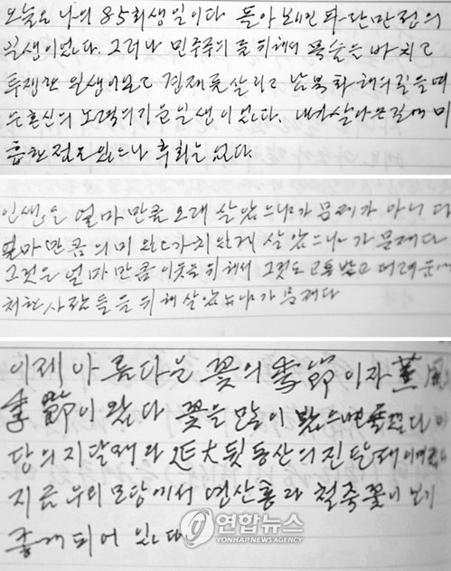 但他還進(jìn)行自我激勵(lì)說(shuō):“盡管吃了很多苦,但也取得了與眾不同的成功,年齡也已經(jīng)是85歲,在這世界上還有什么可盼的呢?一定要保持健康,為解決民主主義、國(guó)民經(jīng)濟(jì)、南北問(wèn)題等進(jìn)行必要的諫言和努力。”(4月27日)