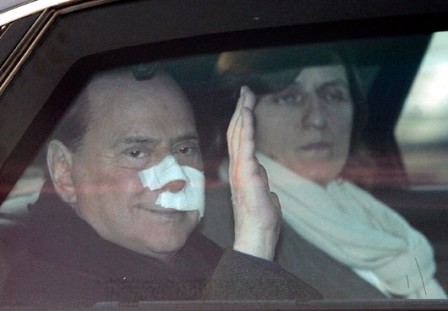現(xiàn)年73歲的意大利總理貝盧斯科尼13日出席一場政治集會時,遭攻擊者以石制米蘭大教堂模型丟擊中臉部,鼻梁被打斷,牙齒也掉了兩顆。他臉部和嘴唇被割傷、血流滿面的狼狽鏡頭,短短數(shù)秒之內就被媒體播送到全球數(shù)百萬觀眾的眼前。