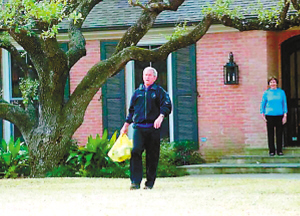 布什經(jīng)常被勞拉打發(fā)上街買雜物,或者帶著寵物狗巴尼在社區(qū)閑逛,提著塑料袋親自為狗“善后”。閑暇時(shí)間布什還經(jīng)常和勞拉一起去看看球賽,參加社區(qū)活動(dòng)。