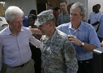 這兩位前總統(tǒng)是于本周一到海地進(jìn)行人道訪問,視察當(dāng)?shù)?月12日大地震后的災(zāi)情。兩人特地到首都太子港探訪災(zāi)民,當(dāng)經(jīng)過頹垣敗瓦的廢墟時(shí),不約而同和居于臨時(shí)帳篷的災(zāi)民握手。