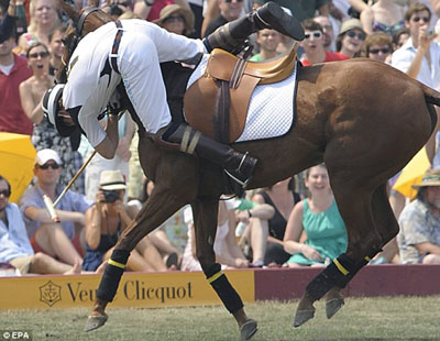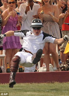 美國當?shù)貢r間27日,哈里王子來到紐約總督島參加慈善馬球比賽,為非洲貧困國家的艾滋病孤兒們籌集資金。當?shù)鼐用癖鞠胍欢糜踝拥馁愸R英姿卻額外收獲了王子落馬時的窘相。哈里王子跌落后又在地上翻了幾個跟頭,然后迅速起身,看起來身體并無大礙。但他面露羞澀,對這一跤頗感尷尬。