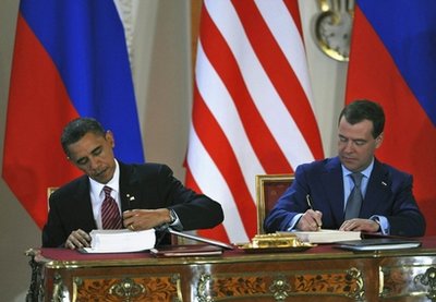 當(dāng)?shù)貢r(shí)間8日中午,俄羅斯總統(tǒng)梅德韋杰夫與美國(guó)總統(tǒng)奧巴馬在捷克總統(tǒng)府西班牙大廳舉行了隆重的簽約儀式。雙方簽署了俄美削減進(jìn)攻性戰(zhàn)略武器的新條約。