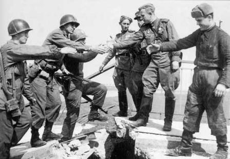 1945年4月25日,一支美軍偵察隊與一隊蘇軍在德國城市托爾高(Torgau)南部易北河畔的一座橋上勝利會師,一幅美蘇兩軍士兵握手的照片從此傳遍世界,成為反法西斯戰(zhàn)爭歐洲戰(zhàn)場出現(xiàn)勝利曙光,希特勒政權(quán)即將滅亡的最廣為人知的象征之一。