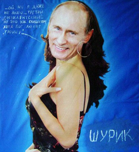 普京一向以“硬漢”形象示人,如今一個(gè)心懷不滿(mǎn)的畫(huà)家,竟然將這個(gè)“硬漢”畫(huà)成一個(gè)身穿低胸吊帶緊身裙,擁有一頭波浪長(zhǎng)發(fā),并戴著大耳環(huán)的女人。這名畫(huà)家已經(jīng)被俄羅斯秘密警察拘捕。對(duì)于自己涉嫌羞辱總理的行為,該畫(huà)家解釋說(shuō)自己是對(duì)普京還想當(dāng)總統(tǒng)一事表示抗議。