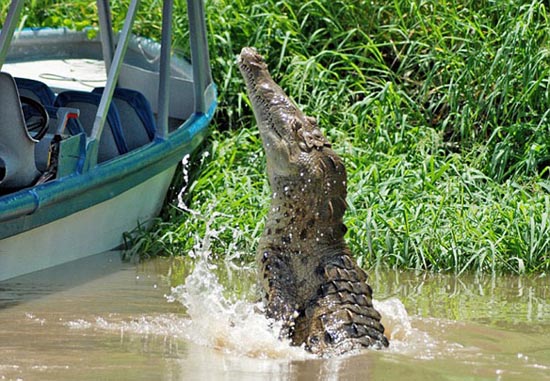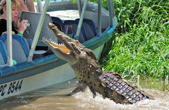 根據(jù)保羅的描述,當(dāng)看到河上那只懶洋洋的鱷魚后,船上的導(dǎo)游就用木棍敲打水面,希望能吸引鱷魚更靠近一些!镑{魚果然隨著木棍游來,越來越近,當(dāng)大家都還沒轉(zhuǎn)過神時(shí),那只原本溫順的鱷魚突然躍出水面,張著血盆大口朝那位女游客撲過去!边@時(shí)船上的所有游客都尖叫起來,大家都拼命向后退。