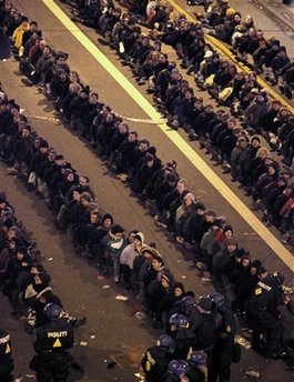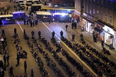 近日來,在哥本哈根舉行的示威活動(dòng)大部分是和平的,但是在當(dāng)天的集會中,有數(shù)百名身穿黑衣的年輕人在街上投磚頭,砸窗戶,警方對此進(jìn)行了干預(yù)。防暴警察包圍了鬧事者,要求他們坐在地上,把手放在身后,然后被集體押上警車。