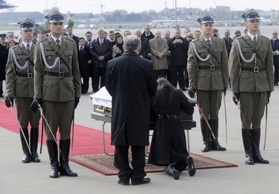 卡欽斯基的靈柩11日由一架波軍直升機從撞機地點俄羅斯斯摩棱斯克運返波蘭首都華沙,代理總統(tǒng)科莫羅夫斯基、總理圖斯克等官員在場迎接,以一場簡短的宗教儀式向其致祭。靈柩將會由軍隊護送到總統(tǒng)府,稍后,當局將會把總統(tǒng)府開放,讓民眾進入瞻仰卡欽斯基的遺容。