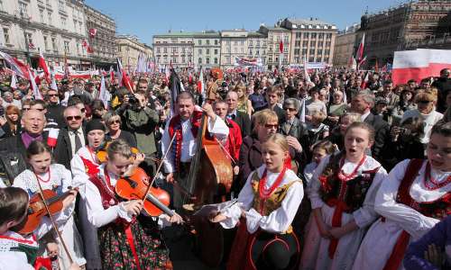 當(dāng)靈車(chē)緩慢穿過(guò)克拉科夫狹窄街道時(shí),哀悼者為卡欽斯基夫婦鼓掌、拋花和揮舞波蘭國(guó)旗?J斯基夫婦的遺體,是用飛機(jī)從華沙運(yùn)抵這里的。