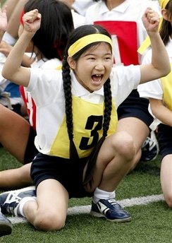 中新網(wǎng)10月18日電 日本皇太子德仁的7歲女兒愛子,17日頭纏黃色頭巾參加校內(nèi)接力跑奪冠。