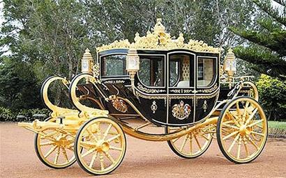 據(jù)報(bào)道,這輛奢華無比的“黃金婚車”名叫“不列顛尼婭(Brittania)”,由澳洲工匠弗萊.克林頓耗時(shí)6年打造。克林頓此前為英國(guó)女王伊麗莎白二世制造過多輛專屬馬車。這輛奢華的“黃金婚車”全車重達(dá)2.5噸,高3米,車身上裝飾有總計(jì)24顆鉆石、130顆藍(lán)寶石和超過400片金葉。車身上一百多塊木材分別取自倫敦塔、19世紀(jì)英國(guó)海軍名將納爾遜的“勝利號(hào)”戰(zhàn)艦以及16世紀(jì)亨利八世國(guó)王的“瑪麗.羅斯號(hào)”戰(zhàn)艦等重要王室建筑和文物,將是迄今為止英國(guó)最具有歷史意義的車輛之一。