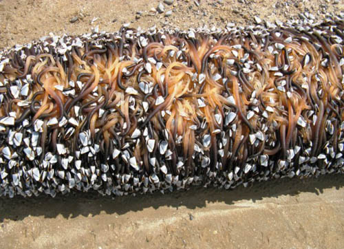 度假游客麗貝卡・波特以為自己看見了“一只活生生的大海怪”。她說(shuō):“它有兩米長(zhǎng),像電線桿子那么粗”,“事實(shí)上它們可能是我見過(guò)的最大型的飄浮的狗爪螺(又稱茗荷兒,鵝頸形藤壺)標(biāo)本”。經(jīng)專家驗(yàn)證后,這個(gè)所謂的異星怪物原來(lái)是不計(jì)其數(shù)的狗爪螺。它們?cè)旧钤诤Q笊钐,受壞天氣影響從海里翻涌出?lái),并密密麻麻地附著在一塊木頭上隨波逐流,最終到達(dá)海灘,才成了這副模樣。