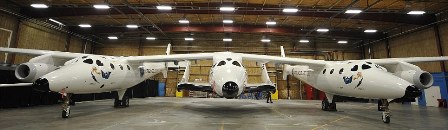 美國(guó)加州州長(zhǎng)施瓦辛格和新墨西哥州州長(zhǎng)比爾.理查森冒著寒風(fēng)參加了“太空船二號(hào)”的揭幕儀式,并開(kāi)香檳慶祝。
